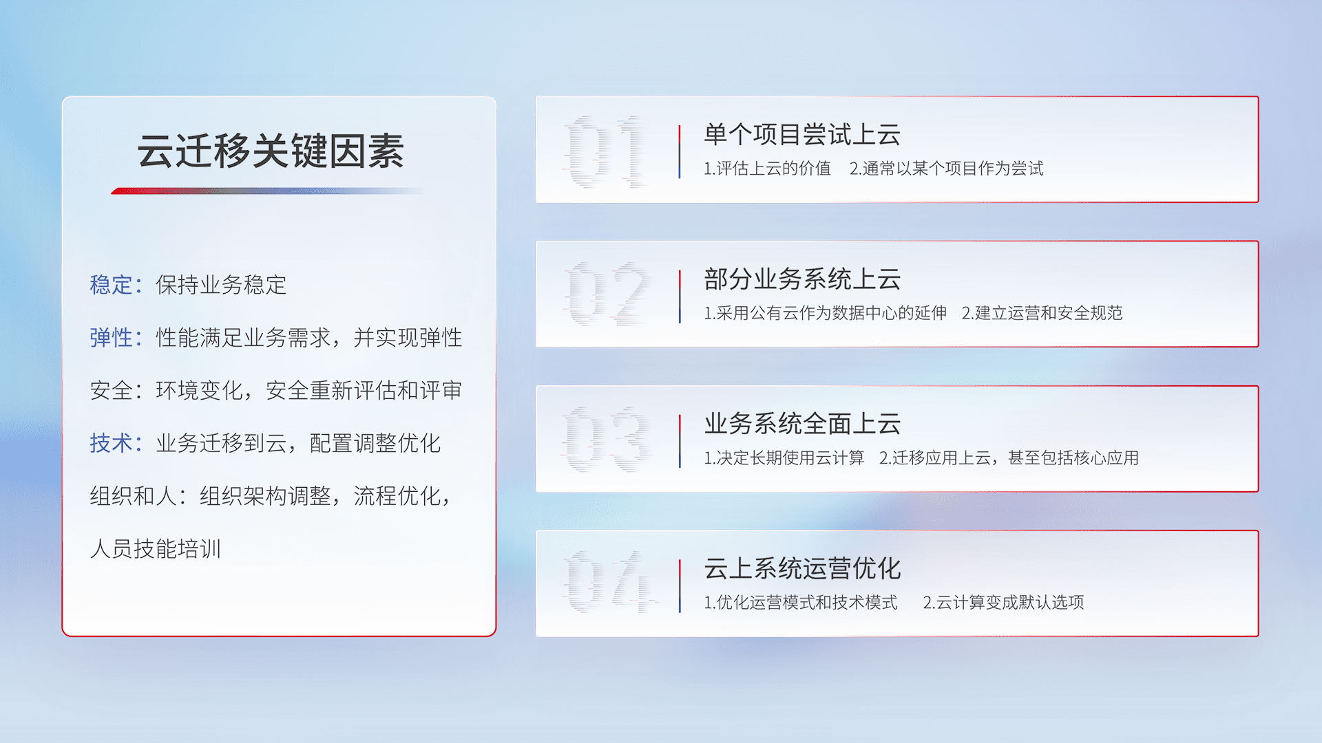 结合实际业务,,从规划设计、、、云平台选型、、、、云原生改造、、、数据迁移、、、集成交付,,,,迁移全过程为客户识别最佳上云路径,,,做好风险识别管理,,,,设计网络架构、、身份权限、、安全审计合规、、、操作审计、、日志审计、、监控告警策略、、多站点容灾设计等,,对云上基础设施进行整体规划,,提升IT治理水平,,以满足弹性、、、高可用、、、高性能的需求。。。