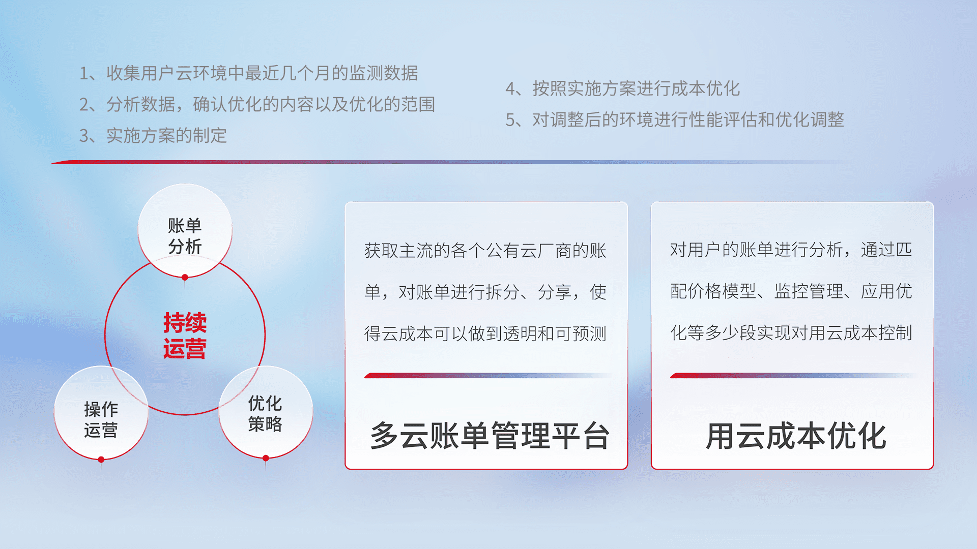 通过多云纳管,,,,以统一的资源数据模型把客户的云资源进行抽象和封装,,,进而实现对多云资源的统一操作,,,,保障云资源管理的可靠性、、稳定性与可用性。。。量身定制化运维内容,,,,配置、、、开发运维、、、补丁管理、、、、备份、、、监控、、认证和访问管理、、审计和日常巡检等,,保障在用云过程中的可靠度,,,,稳定度以及高可用率。。。
